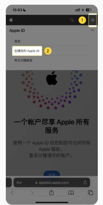 2、点击右上角下拉菜单,选择创建你的Apple ID,注意注册海外Apple ID并使用海外ID