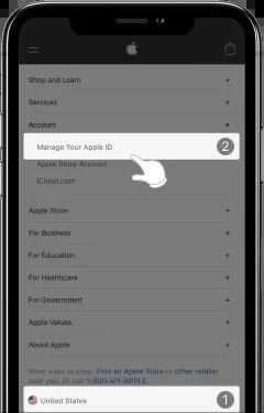 2、将页面拉到最底部,切换国家到 United States >> 点击 Account >> Manage Your Apple ID >> 在新页面底部点击 Create Your Apple ID