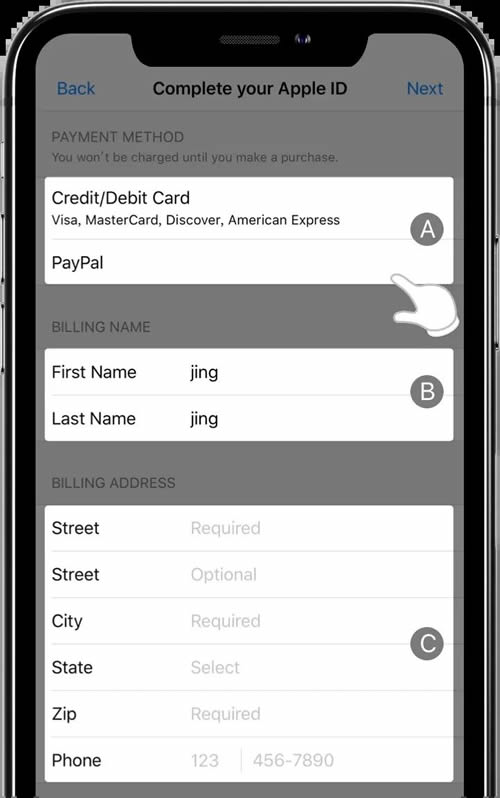 区域C:此处为地址与电话信息。填写第一个 Street 为街道地址,必填字段;第二个 Street 可以不填 ; City 为城市;State 为州;Zip 为邮编;Phone 为电话号码。您可以使用附录中的方法获取一个虚拟的美国地址与电话信息。