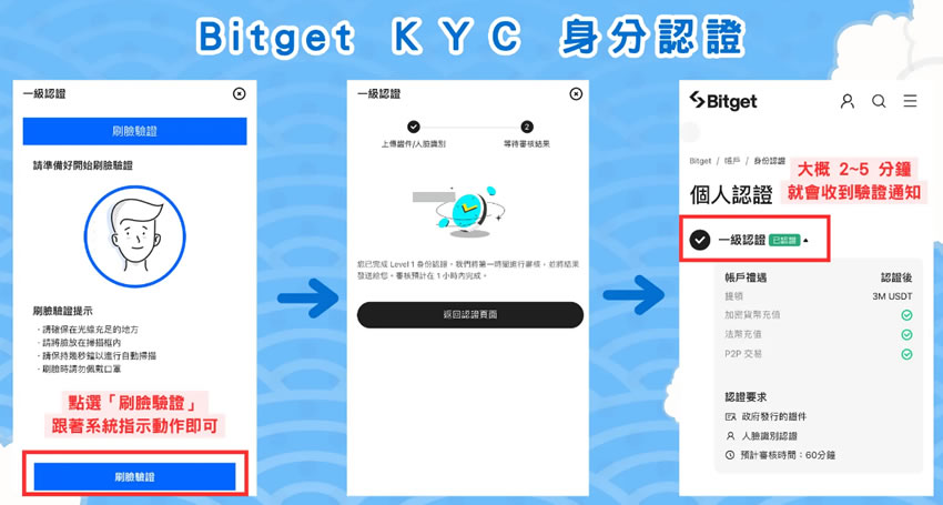 提交后我们就完成KYC 身分认证,接着就是等待官方进行验证,只需等到2~5 分钟左右即可知道结果,如果资料有问题的话再补传即可