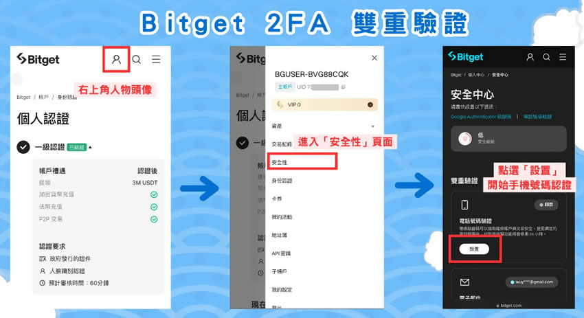 点选「右上角人物头像」,进入「安全性」页面,在电话号码验证区块点选「设置」,接着照着下图操作即可: