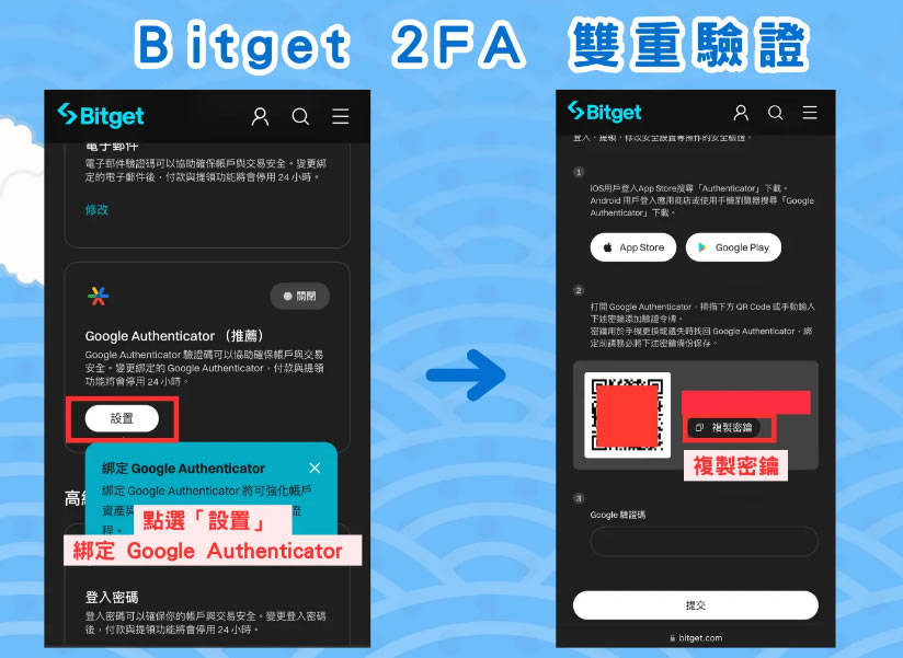 Google Authenticator 的部分,一样点选「设置」,Bitget 会给你一串密钥,点选「复制密钥」,接着打开你的Google Authenticator。